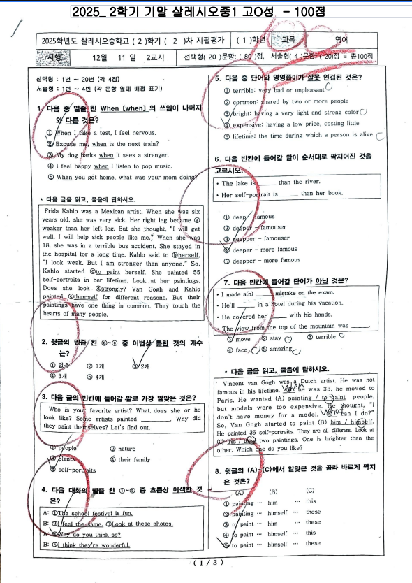25년 2학기 기말 고O성 _ 100점 !! 페이지 정보 작성자 김성준영어학원 작성일25-12-16 16:01 조회37회 댓글0건 관련링크 다음글 목록 답변 본문 이번 2학기 기말고사에서 살레시오 중1 고O성 학생이 100점을 맞았습니다~ 축하축하!! 다음글 목록 답변